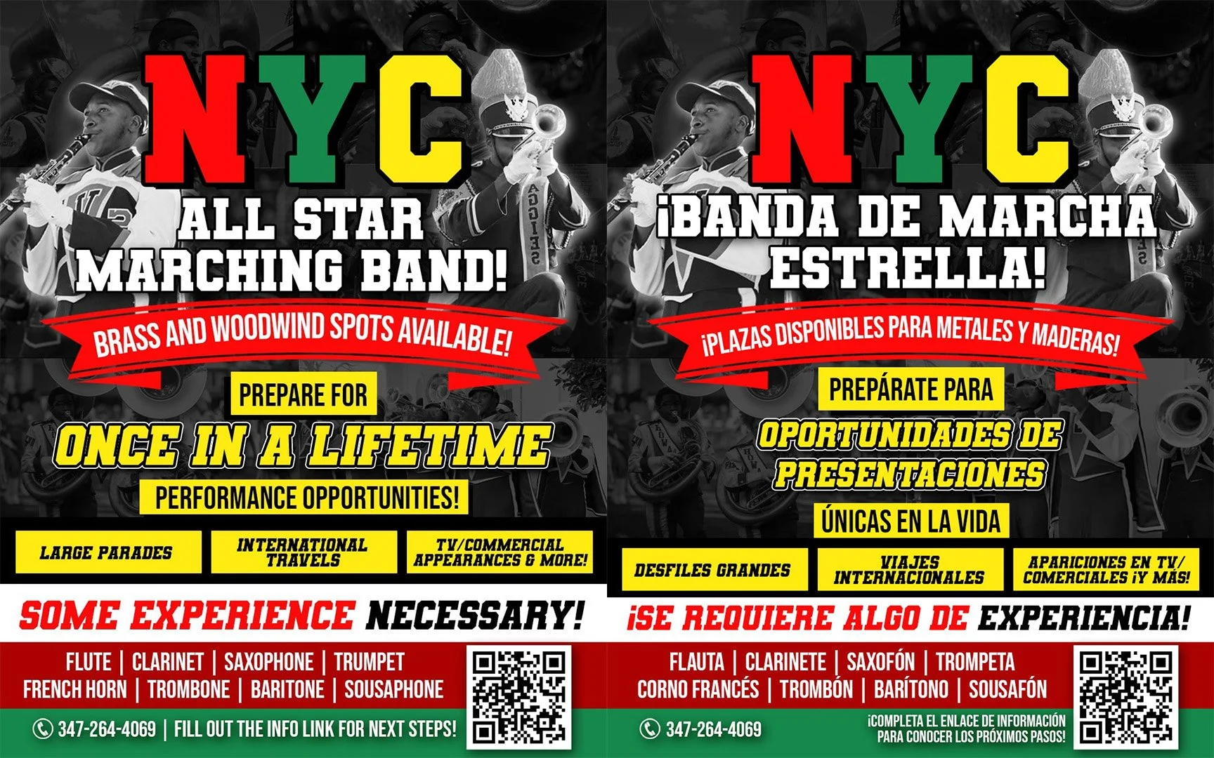 Are you ready to take your musical talent to the next level? The NYC All Star Marching Band is calling all brass and woodwind players from across the city! Join us for an exciting opportunity to perform in large-scale parades, travel internationally, and even make appearances in TV commercials!
